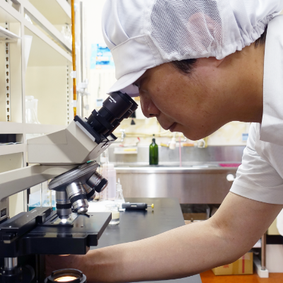 最終製品のみならず、各工程に使用する道具や原料・製品および直接触れる従業員に対して工程に合わせた微生物試験やATPふき取り検査(A3法)を行っております。食中毒の原因でもある一般生菌、真菌(酵母・カビ)、大腸菌などを試験対象としております。また定期的な賞味期限用微生物試験および当社独自の基準に基づいた試験を行い、賞味期限などを決定しております。