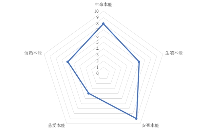 さて、この点を深く理解するために、五本能の器について自己評価してみることとします。あくまで実験ですので、自己評価の方法は何でも構いません。私の場合は下記の方法で自己評価を行いました。