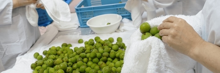 梅の種子の中心=「梅核」は梅雲丹には欠かせない原料です。まずは収穫したばかりの梅を良く水洗いをし、一つ一つ丁寧にヘタを取り除いたのち、拭き上げます。そして、タンクの底に塩を敷き、梅を入れては塩入れするを繰り返し、別のタンクではアルコールに漬け込みます。その後、樽の中で6年間ゆっくりと熟成をさせます。熟成した梅は果肉外し、種を割って取りだした梅核をすりつぶし、果肉と一緒に裏漉しして練り合わせ、口の中で溶けてしまうほどの“とろみ”へじっくり仕上げていきます。