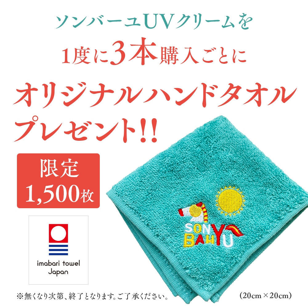 ソンバーユUVクリームを1度に3本購入ごとに【限定1,500枚 オリジナルハンドタオル】をプレゼントさせていただきます。