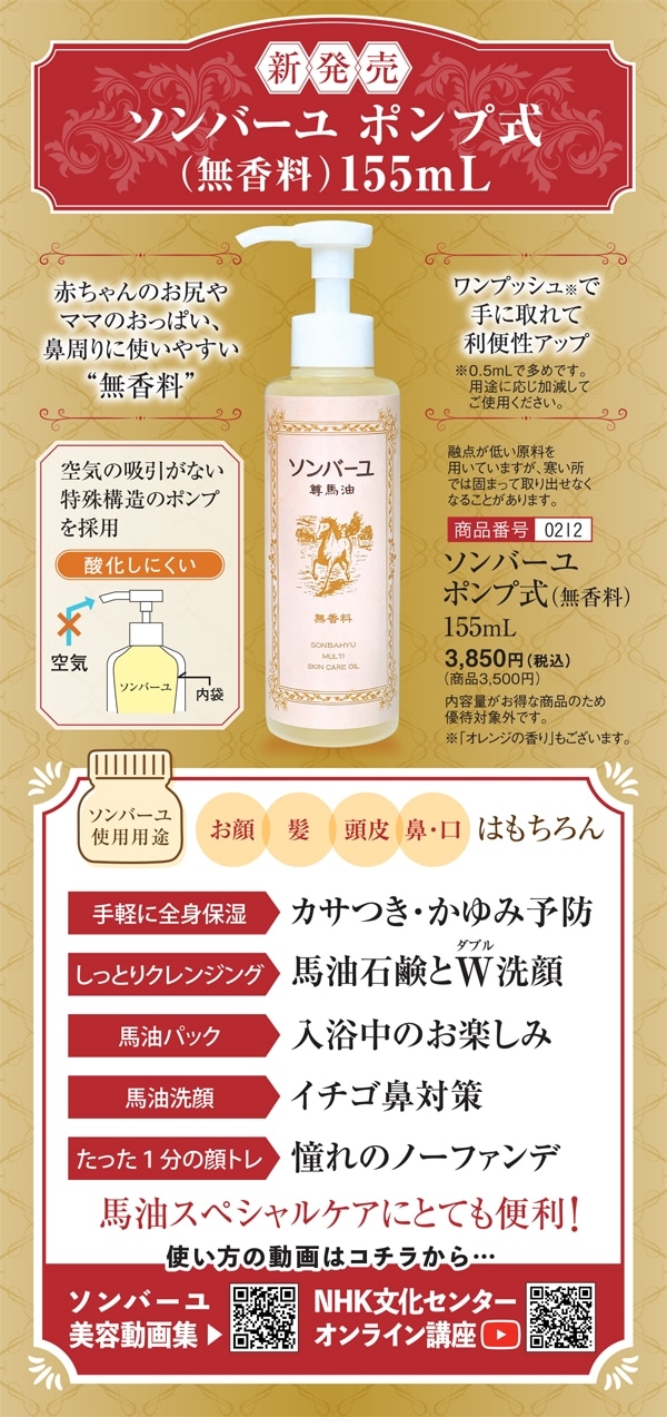 ワンプッシュで手に取れる便利なポンプ式のソンバーユ。